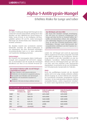 Zudem kommt es durch die fehlerhafte Synthese und Sekretion von AAT zu einer Akkumulation in den Hepatozyten. Dies bedingt eine chronisch aktive Hepatitis und führt langfristig zur Leberzirrhose mit erhöhtem Risiko für ein hepatozelluläres Karzinom (HCC). Die vollständige Diagnostik des AAT-Mangels ist mehrstufig und umfasst neben der Bestimmung der AAT-Serumkonzentration mit zeitgleicher CRP-Bestimmung bedarfsweise eine nachfolgende Genotypisierung und ggf. Sequenzierung des SERPINA-1-Gens (siehe Abbildung).