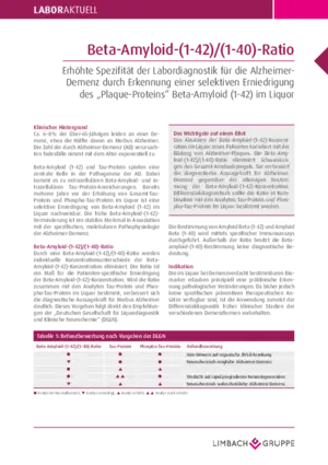 Beta-Amyloid (1-42) und Tau-Protein spielen eine zentrale Rolle in der Pathogenese der Alzheimer- Demenz. Dabei kommt es zu extrazellulären Beta-Amyloid- und intrazellulären Tau-Protein-Anreicherungen. Bereits mehrere Jahre vor der Erhöhung von Gesamt-TauProtein und Phospho-Tau-Protein im Liquor ist eine selektive Erniedrigung von Beta-Amyloid (1-42) im Liquor nachweisbar. Die frühe Beta-Amyloid-(1-42)Verminderung ist ein stabiles Merkmal in Assoziation mit der spezifischen, molekularen Pathophysiologie der Alzheimer-Demenz. Wird die Ratio zusammen mit den Analyten Tau-Protein und Phospho-Tau-Protein im Liquor bestimmt, verbessert sich die diagnostische Aussagekraft für Morbus Alzheimer deutlich.