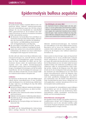 Die Epidermolysis bullosa acquisita (EBA) ist eine subepidermal Blasen bildende Autoimmundermatose, die durch Autoantikörper gegen das 290 kDa schwere Kollagen VII, das den Hauptanteil der Ankerfibrillen bildet, gekennzeichnet ist. Der Nachweis der Autoantikörper in der Haut mittels direkter Immunfluoreszenz und im Serum der Patienten mittels IFT und/oder ELISA stellt eine zwingende Voraussetzung für die Diagnose einer bullösen Autoimmundermatose dar.