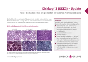 Dickkopf 3 ist ein neuer Biomarker zur Diagnose einer progredienten tubulointerstitiellen Fibrose. DKK3 wird von gestressten Tubuluszellen in den Urin freigesetzt. Der neue Biomarker liefert eine Aussage über das Fortschreiten einer tubulointerstitiellen Fibrose und ist ein unabhängiger Indikator für den Nierenfunktionsverlust. Der neu entwickelte DKK3-ELISA ermöglicht die Erkennung einer chronisch fortschreitenden Nierenvernarbung mit einer einfachen Bestimmung von DKK3 im Urin. Sie eignet sich deshalb hervorragend als Zusatzinformation zur GFR, einem etablierten Parameter der Nierenfunktion, um den individuellen Verlauf einer chronischen Nierenschädigung besser abzuschätzen. Bei einem negativen Ergebnis (DKK3 < 200 pg/mg Kreatinin) liegt mit hoher Wahrscheinlichkeit keine Progression der chronischen Nierenschädigung vor. Im Falle eines positiven Ergebnisses (DKK3 > 200 pg/mg Kreatinin) liegt mit hoher Wahrscheinlichkeit eine progrediente chronische Nierenschädigung vor. Die Interpretation der DKK3-Ergebnisse sollte immer in Verbindung mit der GFR erfolgen.