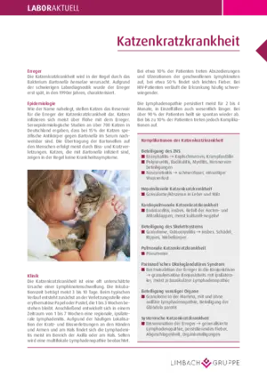 Die Katzenkratzkrankheit wird in der Regel durch das Bakterium Bartonella henselae verursacht. Bei klinischem Verdacht auf eine Bartonellen-Infektion sollte Serum für die Bestimmung von Bartonellahenselae-IgM- und -IgG Antikörpern eingesandt werden. Da der Antikörpernachweis in der frühen Erkrankungsphase noch negativ ausfallen kann, sollte bei fortbestehendem klinischem Verdacht eine Kontrolluntersuchung nach ca. 2 bis 4 Wochen durchgeführt werden.
