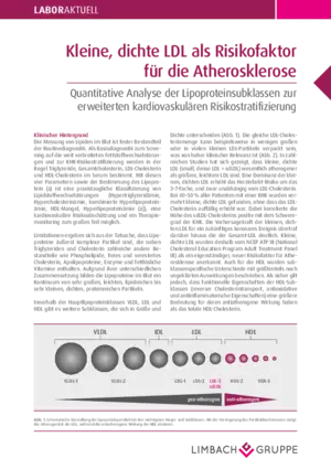Innerhalb der Hauptlipoproteinklassen VLDL, LDL und HDL aber gibt es weitere Subklassen, die sich in Größe und Dichte unterscheiden (Abb. 1). In zahlreichen Studien hat sich gezeigt, dass kleine, dichte LDL (small, dense LDL = sdLDL) wesentlich atherogener sind als größere, leichtere LDL. Eine wachsende Zahl wissenschaftlicher Publikationen zeigt, dass die Berücksichtigung von Lipoprotein-Subklassen und -Partikelkonzentrationen zu einer verbesserten Risikostratifizierung und Vorhersagekraft kardiovaskulärer Ereignisse beitragen kann. Kleine, dichte LDL wurden deshalb vom NCEP ATP III (National Cholesterol Education Program Adult Treatment Panel III) als ein eigenständiger, neuer Risikofaktor für Atherosklerose anerkannt.