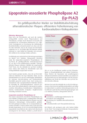 Die Lipoprotein-assoziierte Phospholipase A2 (Lp-PLA2) zeigt, als gefäßspezifisches Entzündungsenzym unabhängig von systemischen Entzündungsvorgängen im Körper an, ob sich in den Gefäßwänden instabile, rupturgefährdete Plaques befinden. Mithilfe des sogenannten PLAC®-Tests, der die Aktivität der Lp-PLA2 ermittelt, kann neben dem Risiko für Herzinfarkte auch das Schlaganfallrisiko abgeschätzt werden.