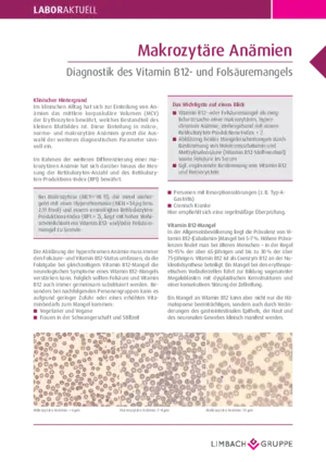 Im klinischen Alltag hat sich zur Einteilung von Anämien das mittlere korpuskuläre Volumen (MCV) der Erythrozyten bewährt, welches Bestandteil des kleinen Blutbildes ist. Die Einteilung in mikro-, normo- und makrozytäre Anämien grenzt die Auswahl der weiteren diagnostischen Parameter sinnvoll ein. Im Rahmen der Differenzierung einer Anämie hat sich darüber hinaus die Messung der Retikulozyten-Anzahl und des Retikulozyten-Produktions-Index (RPI) bewährt. Bei Makrozytose (MCV > 98 fl), die meist einhergeht mit einer Hyperchromasie (MCH > 34 pg) und einem erniedrigten Retikulozyten-Produktions-Index (< 2), liegt mit hoher Wahrscheinlichkeit ein Vitamin B-12- und/oder Folsäuremangel zu Grunde.