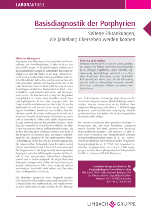Porphyrien sind Störungen der Häm-Biosynthese. Sie können sowohl als primär erythropoetische wie auch als primär hepatische Störungen in Erscheinung treten. Auch können beide und ggf. weitere Organsysteme betroffen sein. Die dadurch entstehende Vielfalt der klinischen Ausprägung dieser Stoffwechselstörungen erschwert bzw. verzögert deren Diagnose. Anhand der klinischen Symptome kann eine erste Verdachtsdiagnose erstellt werden, die die Grundlage für das labordiagnostische Vorgehen bildet. In vielen Fällen empfiehlt sich dennoch zunächst ein Screening, dem im Bedarfsfall eine stufendiagnostische Differenzierung folgen kann (siehe Laborpfad). Das in der Limbach Gruppe angesiedelte „Deutsche Kompetenz-Zentrum für Porphyriediagnostik und Konsultation“ bietet hierzu ein umfassendes Spektrum an labordiagnostischen Leistungen.