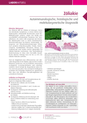 Die Zöliakie ist eine häufige entzündliche Erkrankung, die bei genetischer Prädisposition durch glutenhaltige Nahrungsmittel ausgelöst wird. Bei klinischem Verdacht auf eine Zöliakie sollten primär Transglutaminase-Ak (IgA) oder Endomysium-Ak (IgA) bestimmt und ein IgA-Mangel ausgeschlossen werden. Diese Empfehlung gilt für alle Altersgruppen. Bei vermindertem Gesamt-IgA sollten Gliadin-Ak (deamidiert, IgG) oder Transglutaminase-Ak (IgG) untersucht werden.